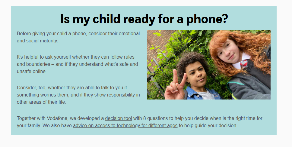 The NCPCC and Vodafone have created an online tool to help parents decide whether their child is ready to have their own phone.